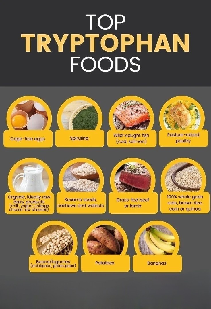 Hydration is also important and should consist of eight or more 8 ounce portions of filtered water, herbal tea, or vegetable juice. Since tryptophan is an important amino acid for depression because it can help boost serotonin levels, foods rich in tryptophan such as eggs, baked potato, dairy, chicken, and salmon should be consumed at each meal.