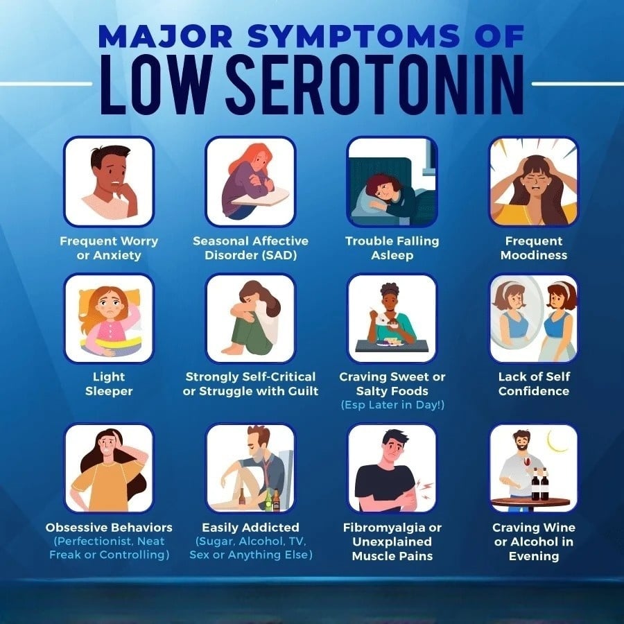 Some physical symptoms that indicate low levels of serotonin include gut and heart problems, sleep problems, fibromyalgia and other pain conditions, and cravings for carbohydrates, alcohol, and certain drugs. Gut problems can indicate low serotonin because surprisingly 90% of serotonin is in the gut, not the brain. Serotonin can help prevent fibromyalgia and other pain conditions because it has a powerful muscle relaxing effect and powerfully stimulates our natural pain killers, known as endorphins. Cravings for carbohydrates are common with serotonin deficiency because carbohydrates trigger a release of insulin that takes up the other amino acids that normally compete with tryptophan to get into the brain; thus, they allow tryptophan to enter the brain when the other amino acids are taken into the other tissues.