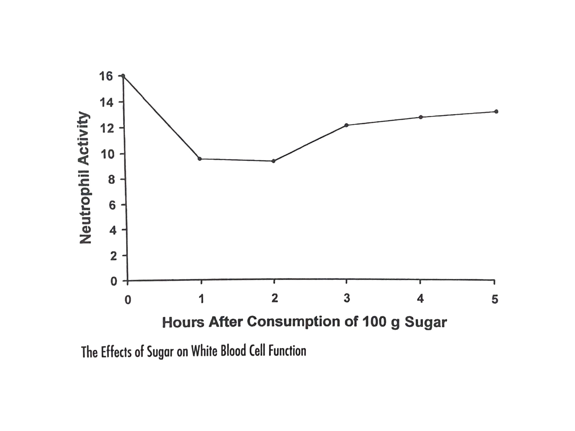 As shown in the chart above, sugar consumption can greatly impact immune function. This chart shows the drop in neutrophil activity hours after ingesting 100g of sugar. Neutrophils make up 60-70% of white blood cell count and thus are a major portion of the body’s immune defense mechanisms, so compromised neutrophil activity can lead to decreased immune function. Additionally, consumption of 75 grams of sugar has been shown to depress lymphocyte response; lymphocytes are the primary white blood cells that fight viruses. The effects of sugar on the immune system may be due to the rise of insulin levels and the competition with vitamin C for membrane transport sites. Vitamin C and glucose compete for absorption into white blood cells, which requires insulin; glucose has a negative effect while vitamin C has a positive effect when absorbed into white blood cells.