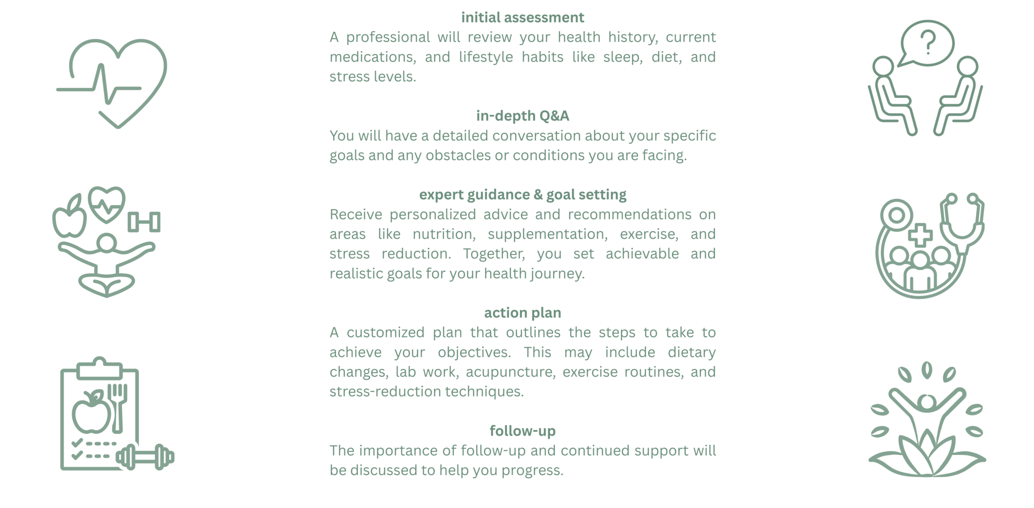 A wellness consultation aims to help you live a more functional lifestyle by focusing on the root causes of any issues and promoting long-term health. It's for those who want to proactively manage their health, address specific concerns, or simply receive guidance on achieving a healthier lifestyle.