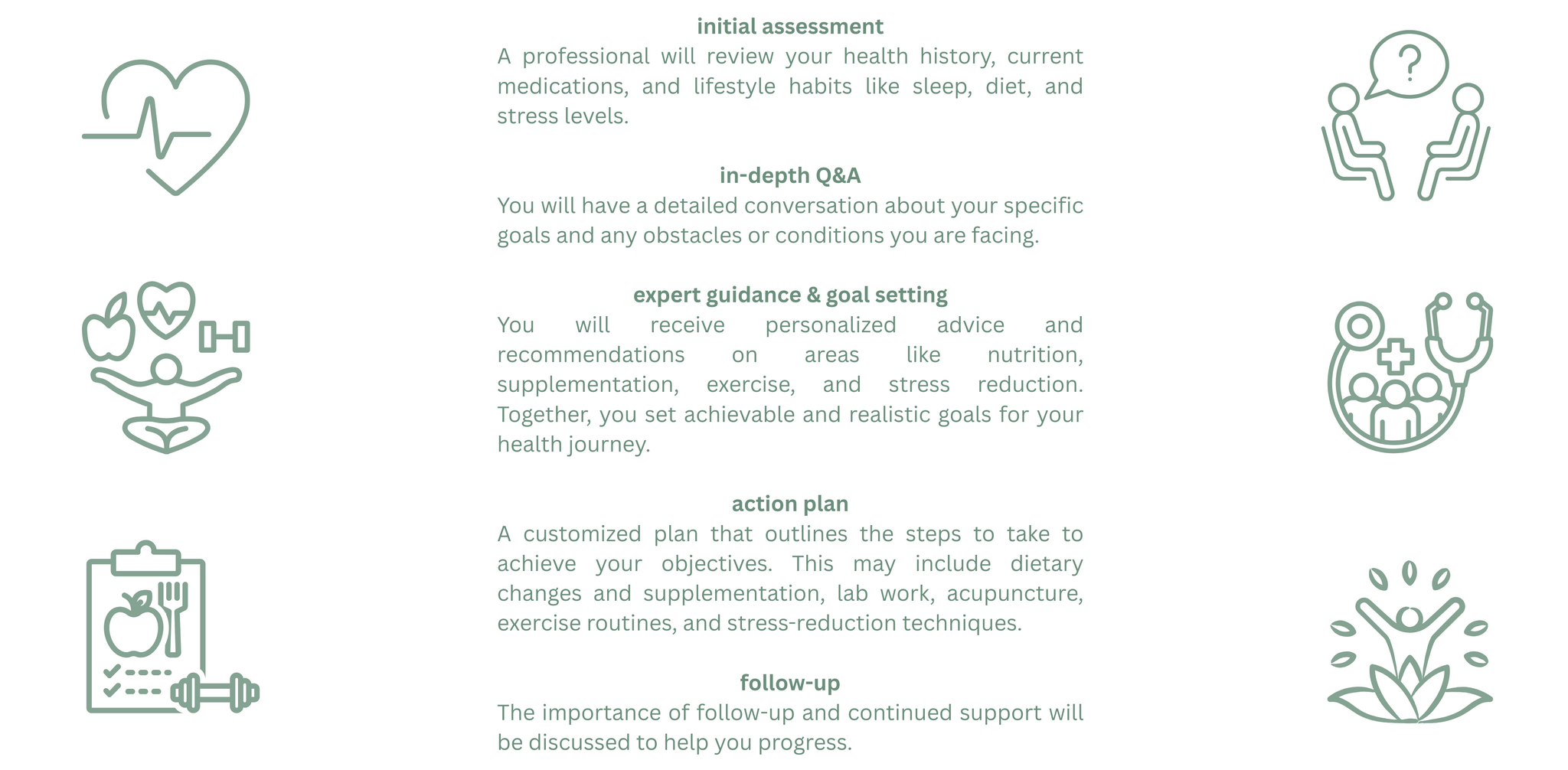 Personalized consultation sessions with a professional to assess condition and overall health. A wellness consultation aims to help you live a more functional lifestyle by focusing on the root causes of any issues and promoting long-term health. It's for anyone who wants to proactively manage their health, address specific concerns, or simply receive guidance on achieving a healthier lifestyle.