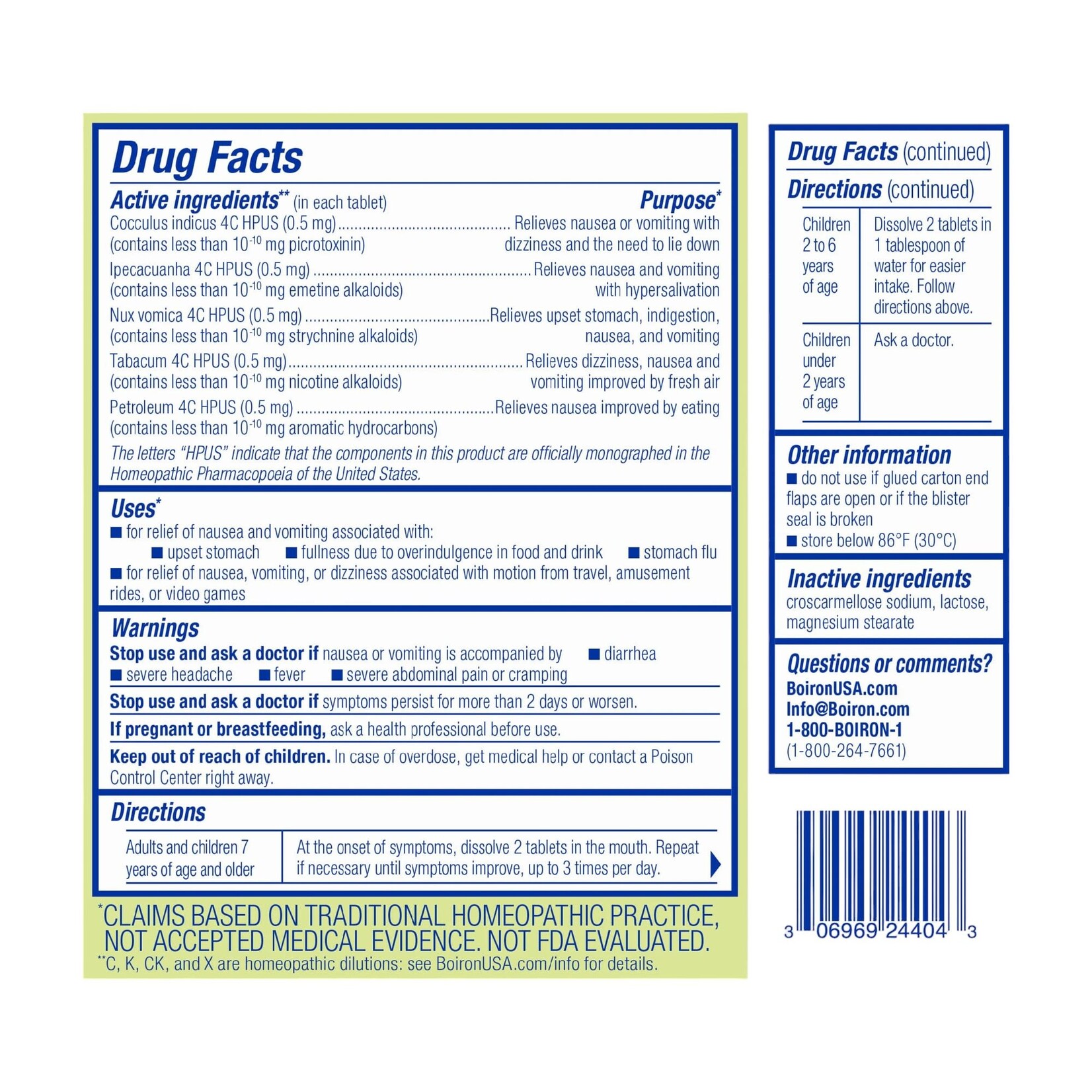 As a homeopathic medicine, NauseaCalm works gently on the body without risk of drowsiness or interaction with other medications, herbs, or supplements. And it doesn’t contain ingredients like caffeine, antihistamines, aspirin, or other NSAIDs that could further upset the stomach. NauseaCalm is recommended for adults and children ages 2 and up. For young children, tablets may be dissolved in water for easier intake. Each travel-friendly box contains 60 unflavored meltaway tablets. This medicine is gluten-free and has no artificial sweeteners, flavors, colors, or preservatives.