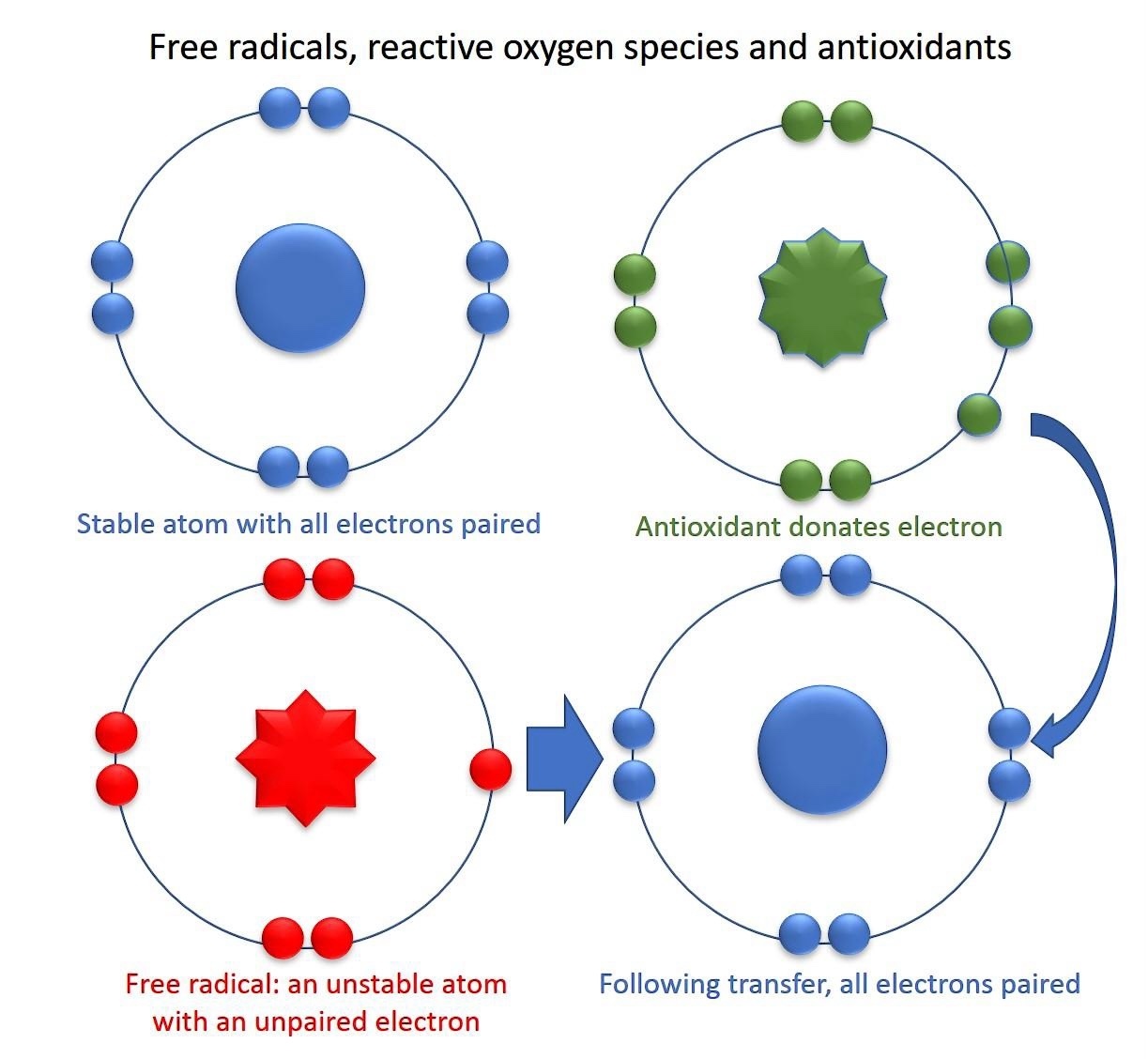 This function of vitamin E is also enhanced by other antioxidants, including vitamin C, beta-carotene, glutathione, Coq10, and selenium; the recycling process for vitamin E required beta-carotene, vitamin C, flavonoids, and Coq10. Oxidation of substances in the body such as fat molecules and eating oxidized fats such as hydrogenated and rancid oils causes the genesis of free radicals, which can lead to chronic inflammation. Vitamin E protects cell membranes, active enzyme sites, and DNA from free radical damage.