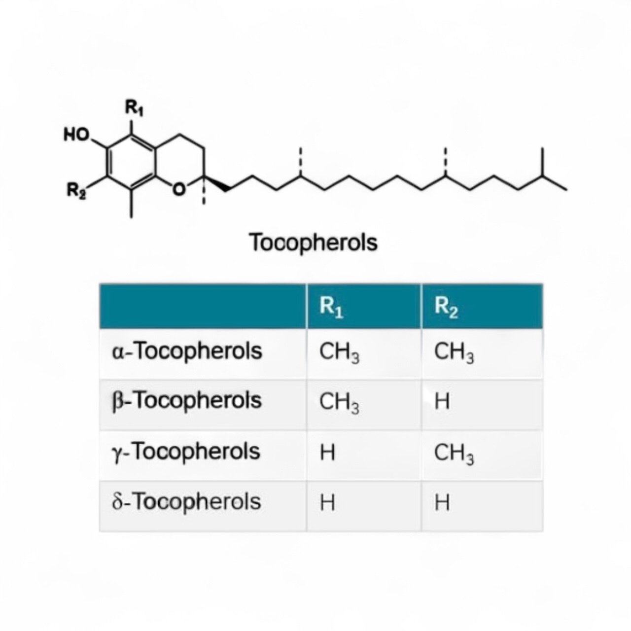 Vitamin E is split into two subgroups: tocopherols and tocotrienols, which both have an alpha, beta, delta, and gamma form. Both groups have the same chromanol ring structure for antioxidant activity, but their molecular tails are different. Tocopherols have a saturated side chain, which makes the structure less flexible. On the other hand, tocotrienols have an unsaturated isoprenoid side chain with three double bonds. This makes their molecular structure shorter and more flexible, allowing them to move more efficiently within cell membranes.